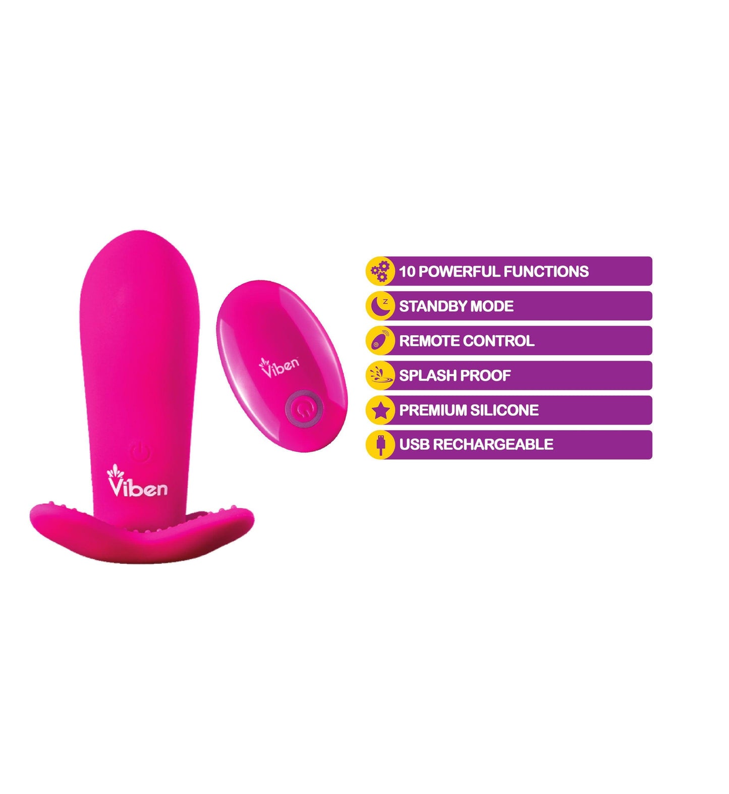 Remote controlled butterfly G-Spot vibe with tickling pleasure nubs, up to 25 ft range with remote. To turn on, press and hold the power button on the toy for 3 seconds and then press the remote power button to turn on remote. Change vibrations by clicking the function button on the remote. May be used with or without the remote control.