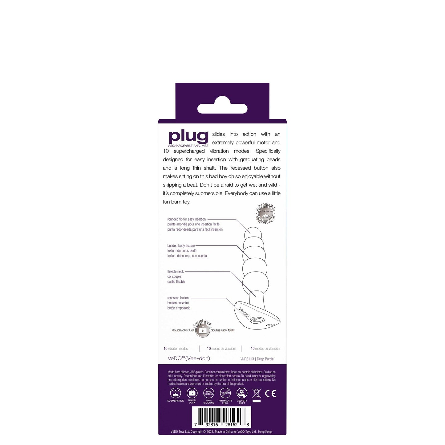 PLUG rechargeable anal plug slides into action with an extremely powerful motor and 10 supercharged vibration modes. Specifically designed for easy insertion with graduating beads and a long thin shaft. The recessed button also makes sitting on this bad boy oh so enjoyable without skipping a beat. Dont be afraid to get wet and wild its completely submersible. Everybody can use a little fun bum toy.